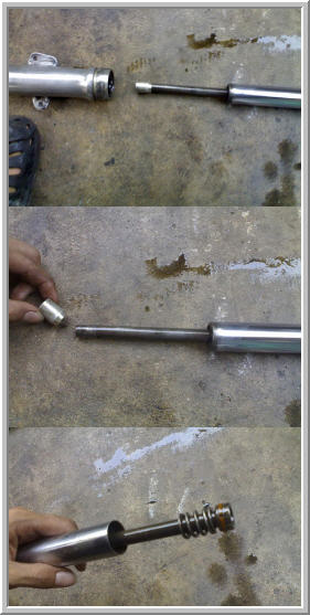ทำตามขั้นตอนที่ 3.ถอดน็อตปิดหัวโช๊คออกโดยใช้ประแจหกเหลี่ยมเบอร์ 14 mm.(หรือถ้าไม่มีใช้น๊อตตัวผู้เบอร์14แล้วใช้คีมล็อกจับ แล้วขันออกก็ได้คับ)และ 4.เมื่อขันน๊อตออกมาแล้วให้ดึงสปริงออกมาแล้วเทน้ำมันเก่าออกน้ำมันเดิมจะมีกลิ่นเหม็นหน่อยละคับ