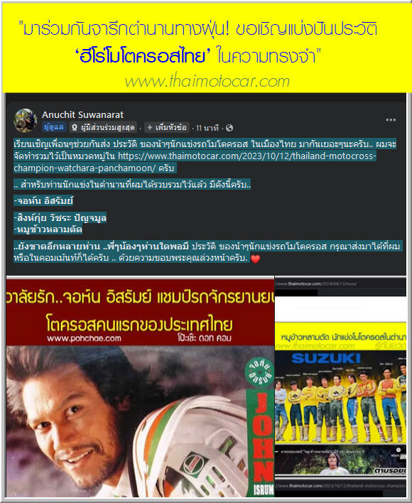 เรียนเชิญเพื่อนๆช่วยกันส่ง ประวัติ ของน้าๆนักแข่งรถโมโตครอส ในเมืองไทย มากันเยอะๆนะครับ.. ผมจะจัดทำรวมไว้เป็นหมวดหมู่ใน https://www.thaimotocar.com/2023/10/12/thailand-motocross-champion-watchara-panchamoon/ ครับ